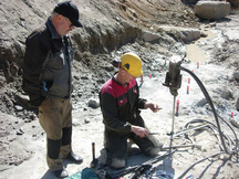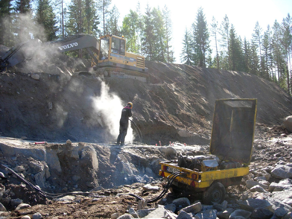 15.8.2017 Heikki Hämäläinen poraamassa kalliokenttää taustavallin edessä. Kenttä paljastui taustavallia taaksepäin siirrettäessä.