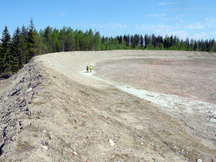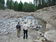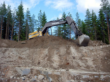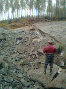 16.8.2017 Reijo Argillander tasapainoilemassa taustavallityömaalla. Alhaalla Heikki Hämäläinen valmistelee kentän panostusta.
