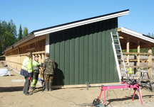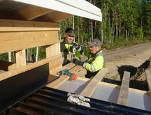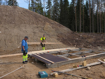1.6.2017 Heikki Hämäläinen tasaamassa pohjaa. Reijo Argillander johtaa ja valvoo ampumakatoksen rakennustyön.
