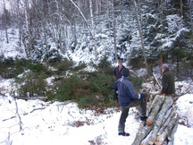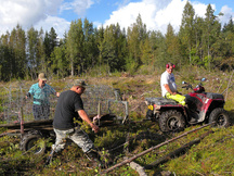 23.8.2016 Tiistai-illan raivaustalkoisiin osallistui 17 miestä. Tässä muutamia innokkaita purkamassa vanhaa raja-aitaa hakkuukoneen tieltä.