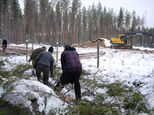 28.10.2016 Talkoolaisia työnsä ääressä. Pintamaita siirrellään ja kantoja kuormataan.